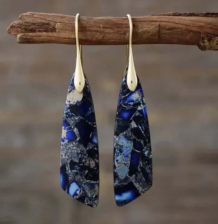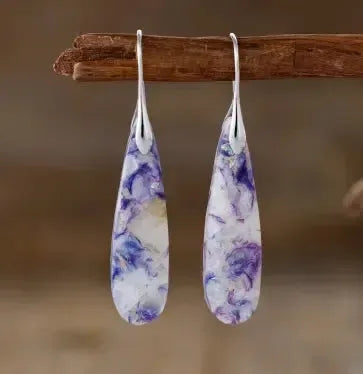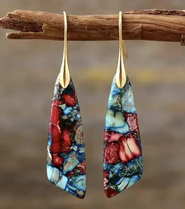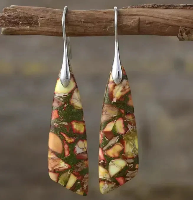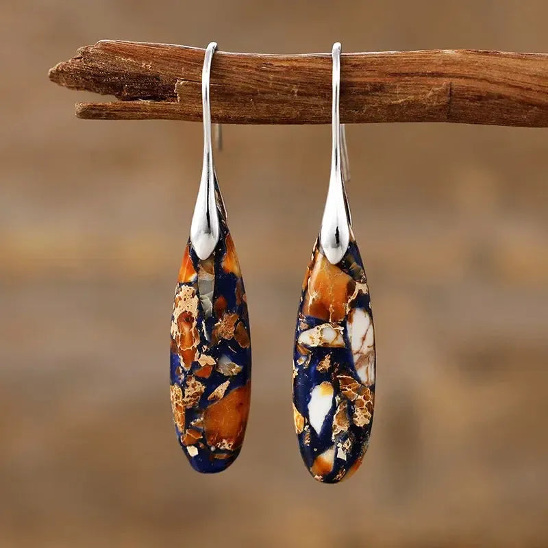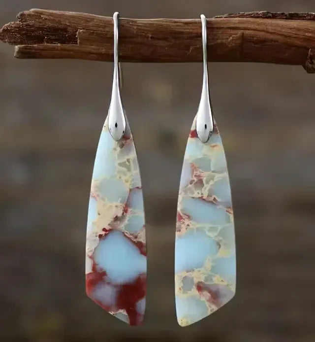 These Bohemian Empire Jasper Teardrop Earrings feature elongated teardrop-shaped Empire Jasper stones, elegantly set on boho-style hooks. Each stone is uniquely patterned, showcasing earthy tones that create a natural, eye-catching aesthetic.