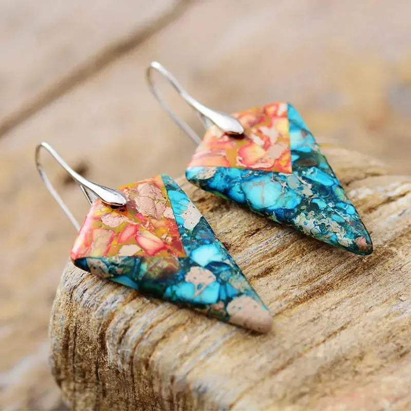 These Imperial Jasper Arrowhead Earrings feature natural imperial jasper stones shaped into bold arrowhead designs with a striking two-tone pattern. The drop style combines bohemian flair with earthy elegance, making them a standout accessory for any outfit.
