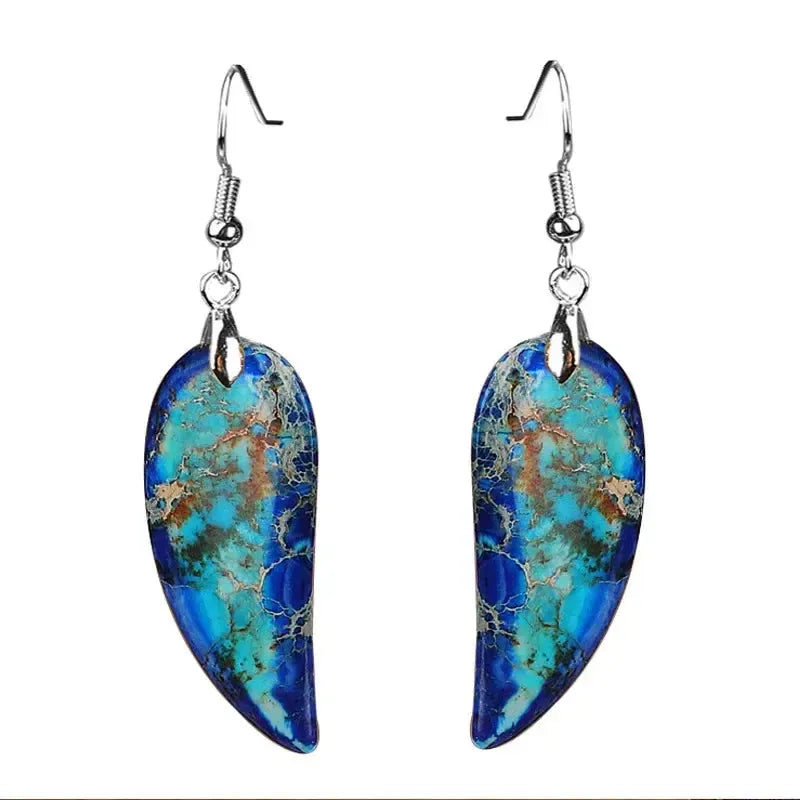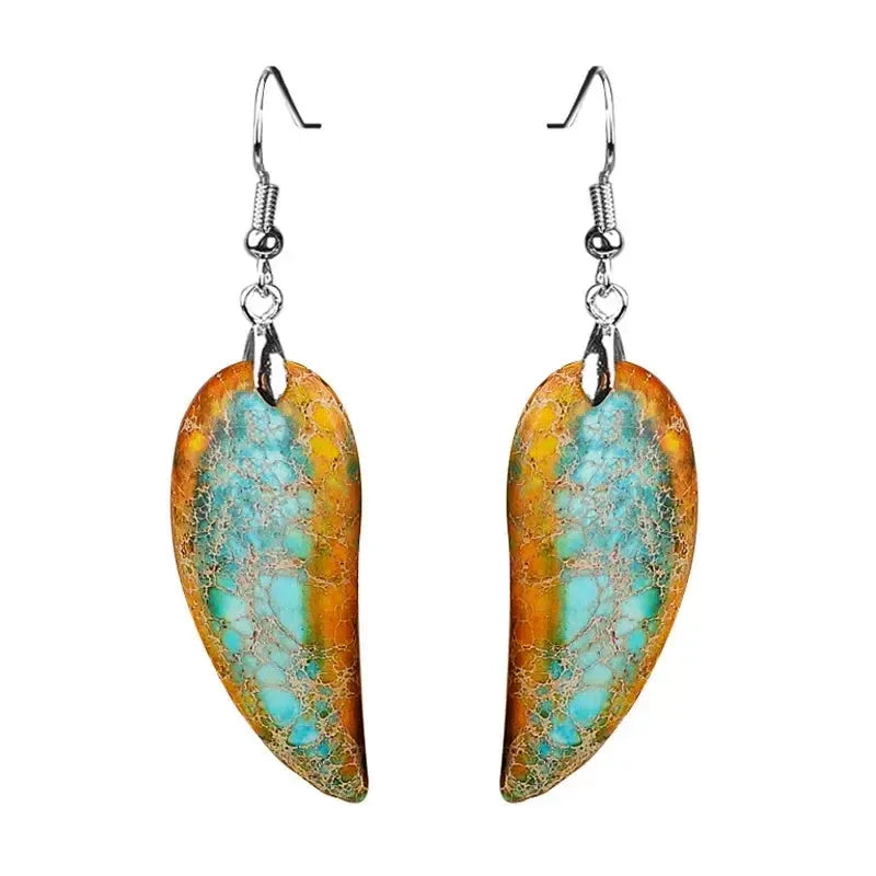 These Imperial Jasper Leaf Earrings feature natural stones shaped into colorful, leaf-inspired dangles. Each earring highlights the earthy patterns and warm tones of imperial jasper, offering a vibrant and unique accessory with bohemian charm.