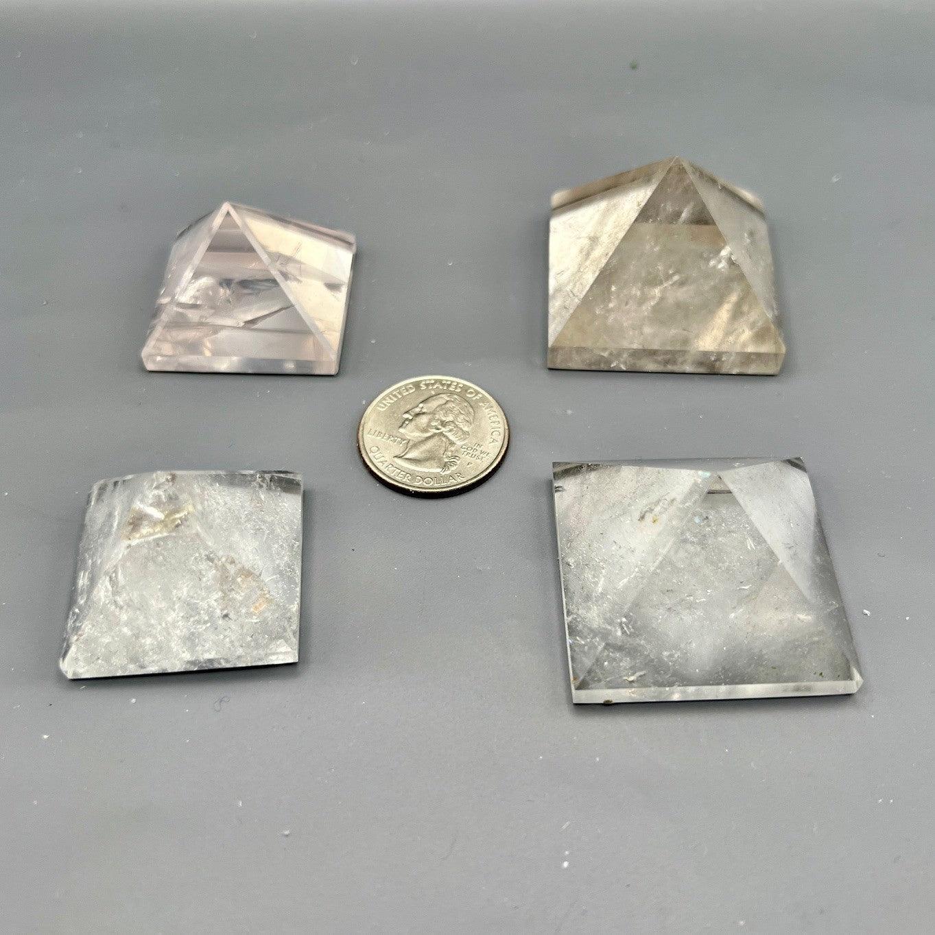 These Clear Quartz Crystal Pyramids feature naturally transparent points polished into precise geometric shapes, highlighting the stone’s clarity and luminous beauty. Each pyramid radiates energy evenly, making it ideal for meditation, display, or as part of a crystal grid.