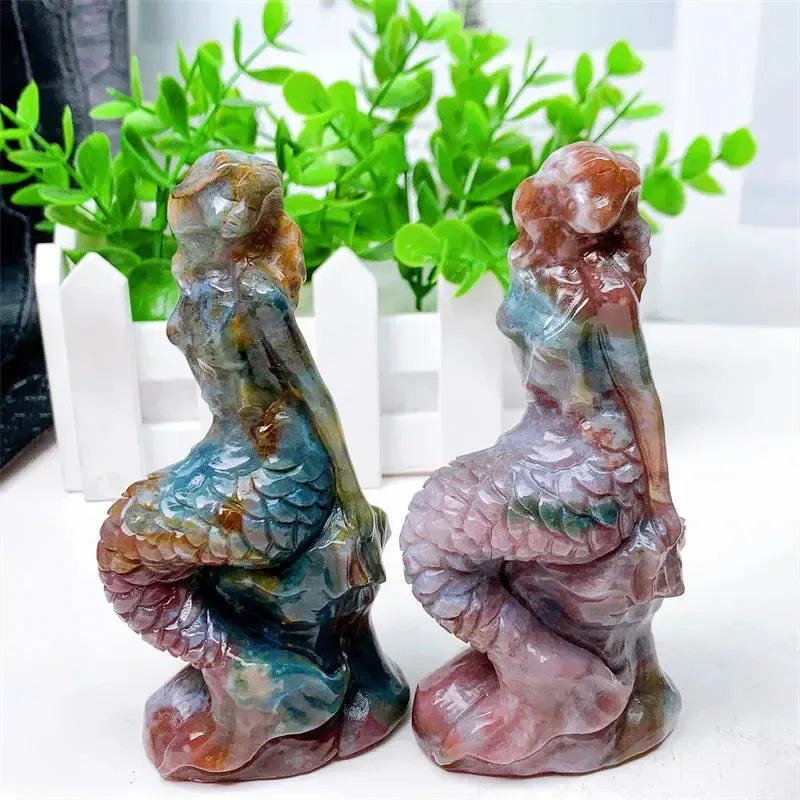 This enchanting Ocean Jasper Mermaid Statue beautifully combines the energy of the sea with the serene charm of mermaid symbolism. Expertly carved from genuine Ocean Jasper, each piece radiates nurturing, joyful energy that inspires emotional balance and creativity. The natural patterns and ocean-like hues make it a captivating work of art for any crystal lover or collector.