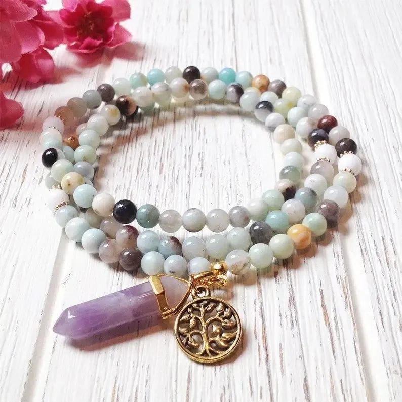 Amazonite 108 Beads Tree Of Life Mala Necklaces w/t Amethyst Guru Bead