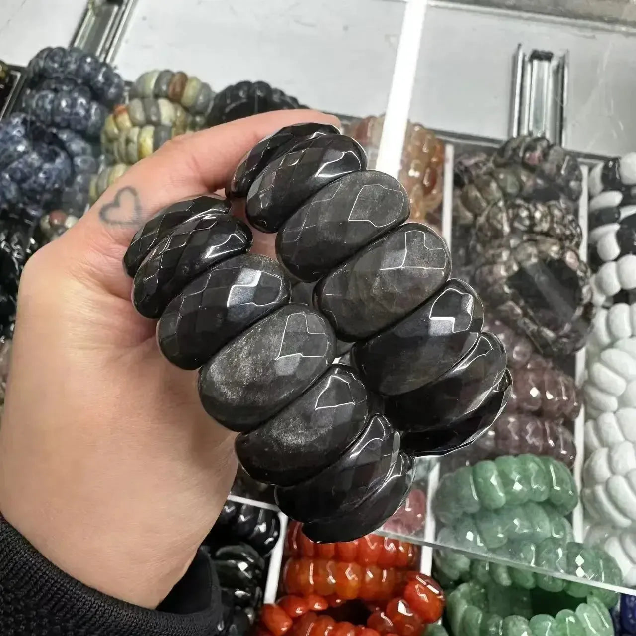 Big Cuff Bangle Crystal Bead Bracelets-Bracelets-Ali-Silver Obsidian-19cm-Crystal Destiny